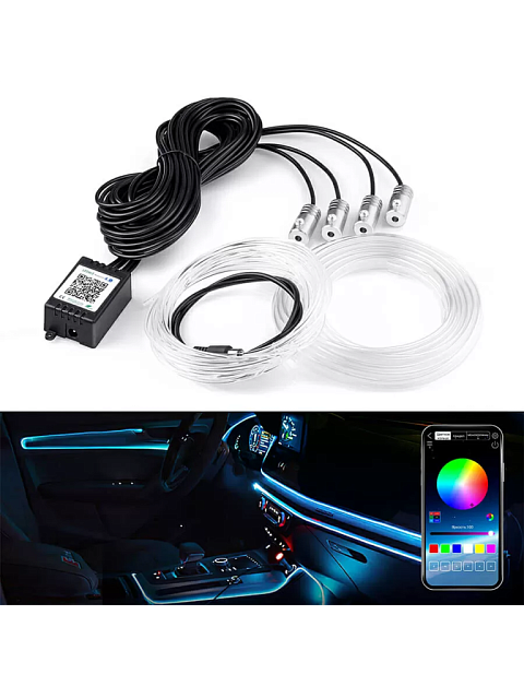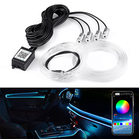 Подсветка салона авто состоит из LED модулей, световодов и блока управления. С ее помощью вы можете создать стильную и функциональную подсветку торпеды и дверных карт