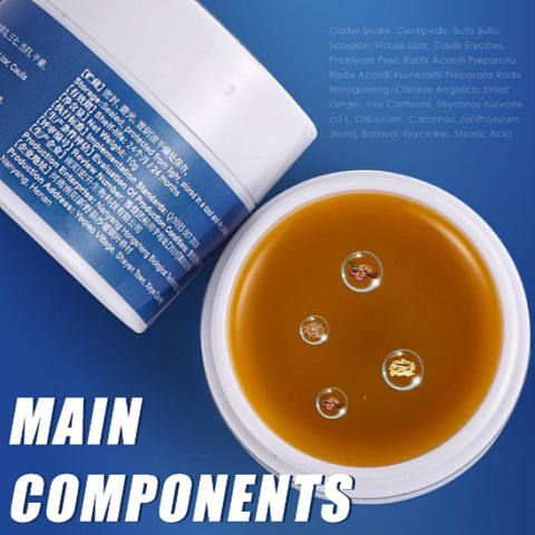 Основные ингредиенты: полынь, имбирь, китайский колючий ясень, сычуаньский аконит, триптеригиум, сафлор, цетиловый спирт, камфора, ладан, мирра, стеариновая кислота, вазелин. -