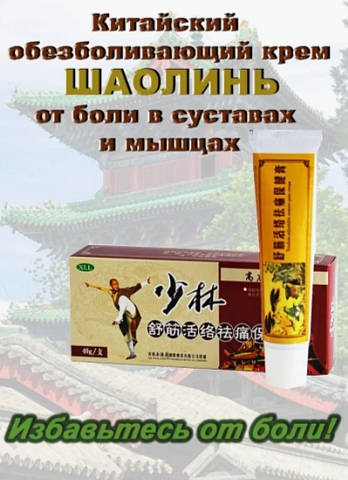 Китайская обезболивающая мазь Шаолинь от боли в суставах и мышцах. Крем обезболивающий для суставов и спины применяют при артрозе, артрите, ревматизме, при болях в мышцах, для облегчения состояния, вызванного перенапряжением и болевым синдромом в области шеи, плечевого пояса, поясницы, коленных суставов и т.д. Разогревающий крем действует быстро, облегчает боли в мышцах и суставах, снимает болевой синдром и отек в травмированных местах, обладает противовоспалительным действием, устраняет мышечный спазм, улучшает обмен веществ и кровоснабжение в околосуставных тканях. Китайский обезболивающий крем эффективен при вывихах, ушибах, травмах суставов, остеохондрозах, артритах, артрозах, растяжениях мышц, суставном ревматизме. Состав: чернохвостая змея, скорпион, сколопендра, дринария, гомаломена ароматная, ломонос китайский, плаун булавовидный, обработанные молодые корнеклубни аконита китайского, аконит дикий, чилибуха, ментол, камфора, борнеол, олибанум, смола коммифоры мирра, стеариновая кислота, цетиловый спирт, вазелин, белое масло, глицерин, триэтаноламин, вода.