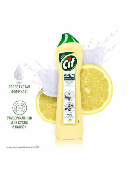 Устали от известкового налета? Не можете удалить пятна в ванной или на кухне? Не нравятся царапины после уборки? Густой чистящий крем Cif 100% удалит грязь на кухне и в ванной, оставляя поверхности 100% сияющими и гладкими. Крем удаляет грязь благодаря силе микрокристаллов, которые помогают добиться чистых, сияющих и гладких поверхностей. Легко нанести, легко протереть, легко смыть. Крем проникает и полностью удаляет такие въевшиеся и застарелые загрязнения, как засохший жир, пригоревшая еда, мыльные разводы и известковый налет. Притом, он не царапает поверхность и обладает приятным свежим лимонным запахом. Улучшенная текстура позволяет легче смывать средство, чтобы сразу насладиться сияющим результатом. По результатам инструментальных тестов в Инновационном центре Unilever средство 100% удаляет ряд типичных загрязнений, оставляя поверхности сияющими и гладкими, какими они были до загрязнения. Чистящий крем подходит для использования на кухне, на таких поверхностях, как плита, варочная поверхность, в том числе стеклокерамическая, мойка, духовой шкаф, столешница и т.д., и в ванной, в таких местах, как раковина, ванна, в том числе акриловая, керамическая плитка, хромированные поверхности, краны и т.д. Для использования нанесите крем на влажную тряпочку или на саму поверхность. Для достижения наилучшего результата оставьте на несколько минут. Потрите и смойте водой. Перед применением обязательно прочтите инструкцию и соблюдайте осторожность при использовании средства.