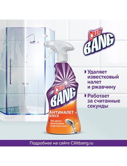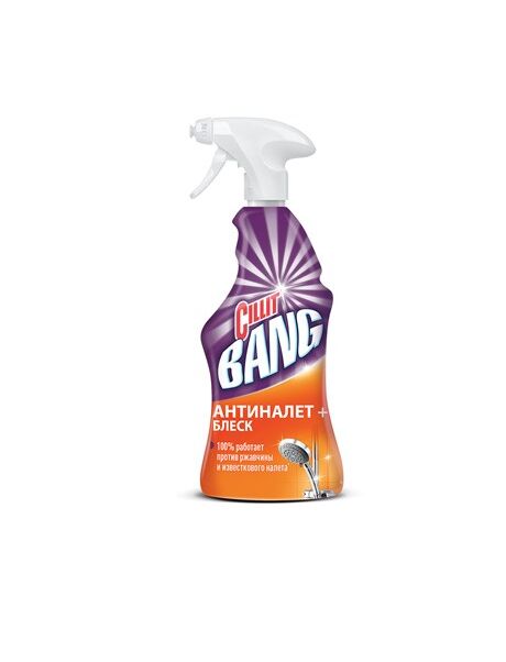 Мощное средство Cillit Bang Антиналет+ Блеск. Bang и грязи как не бывало! Попробуйте по-настоящему мощное средство Cillit Bang Антиналет+ Блеск! Оно эффективно удаляет известковый налет, мыльные разводы, ржавчину и въевшуюся грязь! Чистые поверхности блестят как новые! Идеально подходит для уборки ежедневных или стойких загрязнений, для различных материалов (в том числе керамика, акрил) и поверхностей, таких как ванная, душевая кабина, кафельная плитка, подоконники и др.