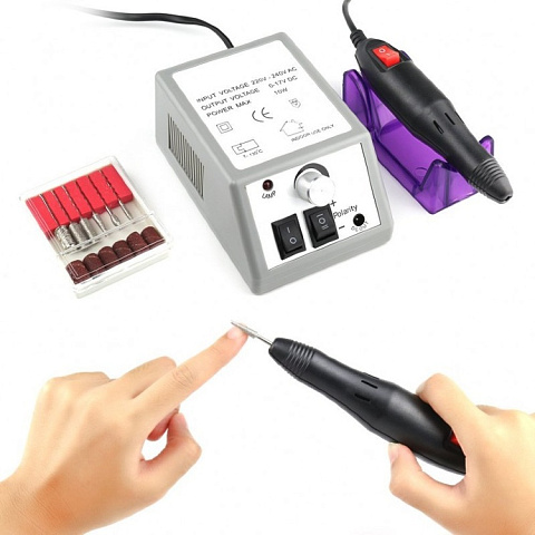 Ручка-держатель аппарата изготовлена из ударопрочного пластика, внутри имеется металлический зажим для фрезы. Фреза входит в зажим плотно и ничем не фиксируется. Машинка максимально проста в использовании, оснащена микропроцессорным регулятором скорости, реверсом и удобной подставкой для ручки, позволяющей уберечь ее от повреждений. Аппарат легкий, эргономичный, работает от сети.