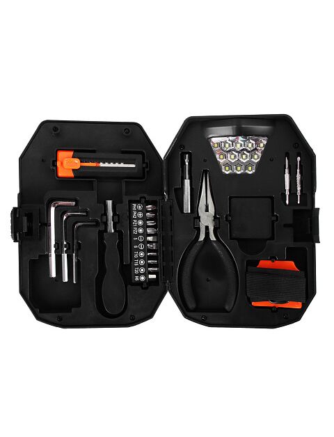 Теперь извлекать и использовать нужные инструменты будет удобно даже при отсутствии источника освещения! Инструментальный набор ЕРМАК с фонарем в компактном футляре включает 24 предмета для разных видов работ, в том числе шестигранники, строительный нож и другие полезные приспособления для бытовых и строительных нужд. Фонарь с двумя головками встроен в корпус футляра, легко выдвигается и имеет настраиваемый угол наклона для комфортного освещения рабочей зоны.