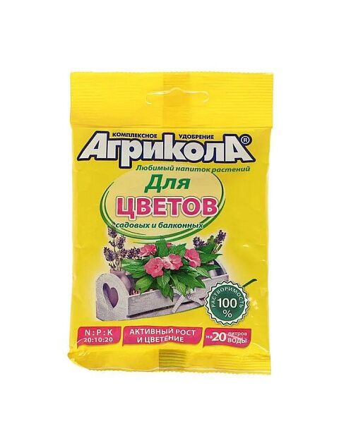 Агрикола, универсальное комплексное удобрение для садовых и балконных цветов: высокоэффективное, бесхлорное, водорастворимое, комплексное удобрение для подкормок комнатных и садовых культур. Цветы в саду и дома дольше радуют своим пышным цветением при регулярной подкормке удобрением Агрикола. Удобрение помогает обеспечить пышное цветение, повышает устойчивость садовых сортов к неблагоприятным факторам окружающей среды, в том числе к весенним и осенним заморозкам. Используется как для корневой, так и для листовой подкормки растений. Необходимые для растений элементы, которые входят в состав «Агриколы», не обязательно вносить в почву, как обыкновенные удобрения. После опрыскивания водным раствором этого удобрения, все нужные питательные вещества легко усваиваются надземными частями растений – листьями и стеблями, что обеспечивает быстрый результат их действия на растение, в отличие от корневой подкормки. Преимущества: высокая экологическая чистота – «Агрикола» не содержит в своем составе хлора, а также солей тяжелых металлов. Удобрение препятствует поступлению нитратов в растения. После проведения листовой подкормки, растения растут быстрее, раньше укрепляются, лучше сопротивляются внешним неблагоприятным факторам и различным болезням.