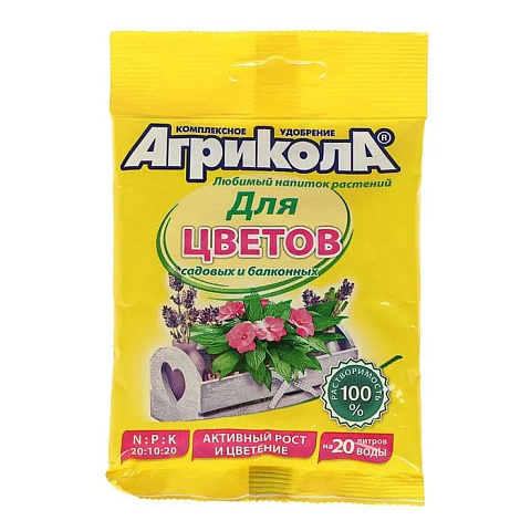 Агрикола, универсальное комплексное удобрение для садовых и балконных цветов: высокоэффективное, бесхлорное, водорастворимое, комплексное удобрение для подкормок комнатных и садовых культур. Цветы в саду и дома дольше радуют своим пышным цветением при регулярной подкормке удобрением Агрикола. Удобрение помогает обеспечить пышное цветение, повышает устойчивость садовых сортов к неблагоприятным факторам окружающей среды, в том числе к весенним и осенним заморозкам. Используется как для корневой, так и для листовой подкормки растений. Необходимые для растений элементы, которые входят в состав «Агриколы», не обязательно вносить в почву, как обыкновенные удобрения. После опрыскивания водным раствором этого удобрения, все нужные питательные вещества легко усваиваются надземными частями растений – листьями и стеблями, что обеспечивает быстрый результат их действия на растение, в отличие от корневой подкормки. Преимущества: высокая экологическая чистота – «Агрикола» не содержит в своем составе хлора, а также солей тяжелых металлов. Удобрение препятствует поступлению нитратов в растения. После проведения листовой подкормки, растения растут быстрее, раньше укрепляются, лучше сопротивляются внешним неблагоприятным факторам и различным болезням.