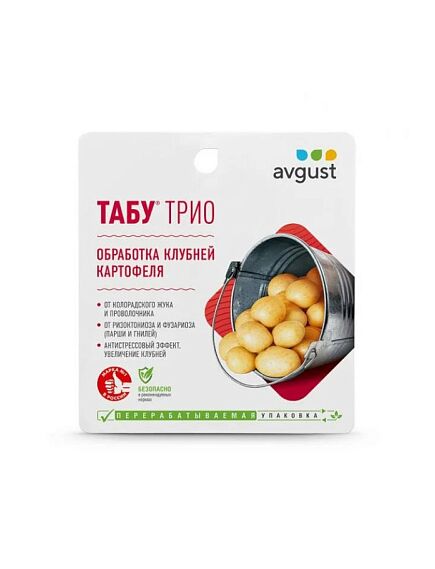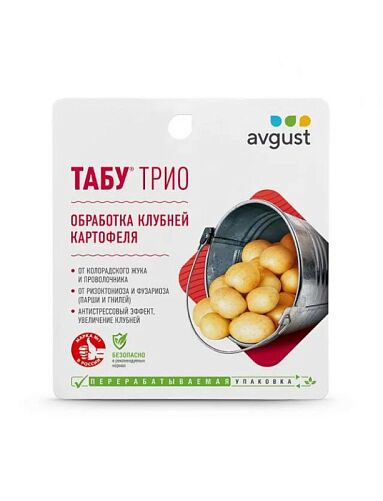 Табу ТРИО протравитель картофеля ( 3 ампулы) используется в виде баковой смеси из трех препаратов.Средство для защиты картофеля применяется путем опрыскивания клубней перед посадкой.
