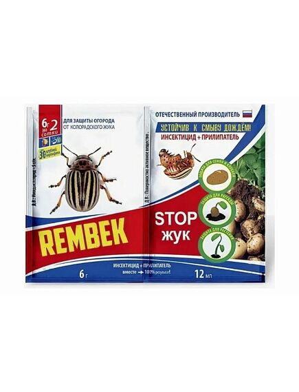 Инсектицидное средство Рембек Стоп Жук – это комплексное действие в борьбе с основными вредителями сада и огорода: колорадскими жуками, тлей, клещами, плодожорками, молью, щитовками, капустницами и другими. Препарат состоит из: поверхностно-активное вещество 12 мл (жидкий прилипатель) и действующего вещества инсектицида, имидаклоприд – 5 г/кг (гранула 6г). Преимущества прилипателя: 1) Улучшает смачивание поверхности листьев растений и способствует лучшему проникновению действующих веществ в растение; 2) Уменьшает поверхностное натяжение раствора препарата; 3) Уменьшает расход раствора препарата, повышает эффективность и продолжительность действия; 4) Равномерно распределяет раствор по поверхности растения; 5) Благодаря микроэлементам повышает засухостойкость. Приготовление рабочего раствора: в 1 л теплой воды растворить содержимое пакета (Rembek STOP Жук 6г), тщательно перемешать и затем добавить прилипатель 12мл. Рабочий раствор довести до необходимого объема, указанного на обороте упаковки Упаковка рассчитана на обработку 200м2 (2 сотки).