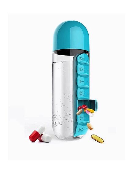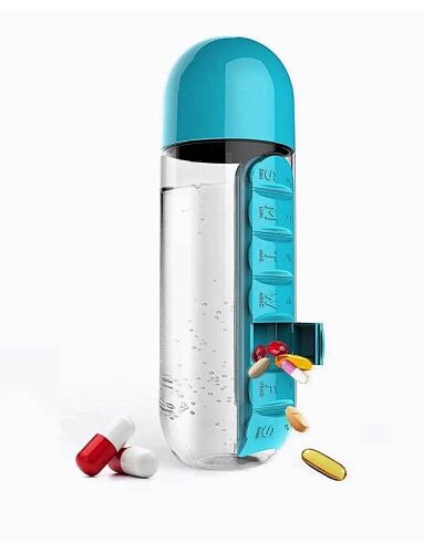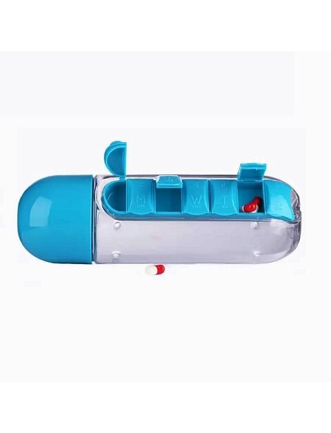 Бутылка со съемным пеналом на 7 секций для таблеток на каждый день недели. Крышку можно использовать в качестве стаканчика для питья.