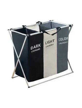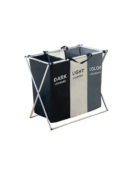 Складная бельевая корзина с тремя отделениями – лучший помощник в организации порядка в доме. Минималистичный дизайн подойдет для любого интерьера, а компактные размеры корзинки для белья и складной механизм позволят хранить ее даже в небольшой ванной комнате. С помощью разделения на секции, вы можете удобно сортировать белье на цветное, черное и белое и не тратить время перед стиркой.Материал: металл, текстиль