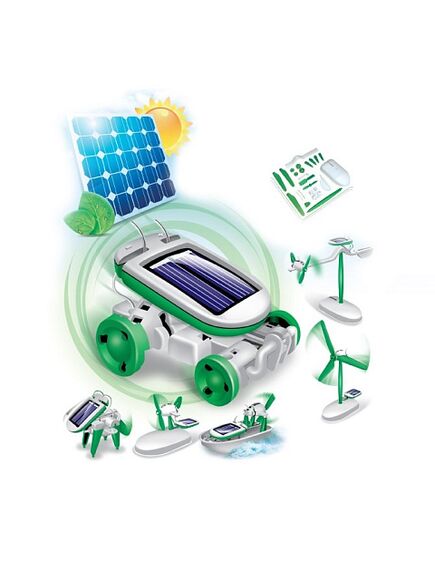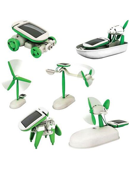 Игрушка-конструктор 6 в 1 предназначена для самостоятельной сборки одной из шести моделей: машинки, собаки, мельницы, лодки, воздушного кораблика или самолета. Будьте осторожны, оторвать ребенка от увлекательного занятия - невозможно! И неудивительно, ведь основные компоненты моделей - электродвигатель и солнечная батарея.Все элементы легко собираются и надежно крепятся между собой. При сборке вам не понадобятся потенциально опасные для ребенка клей и спайка.Как только робот будет собран, можно сразу выходить на улицу и наблюдать, как робот-игрушка двигается, питаемый солнечным светом. Если на улице слякоть или улицу замело снегом то, роботу будет вполне достаточно и света лампы.