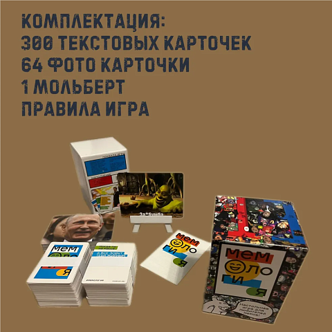 Настольная игра для компании, карточная игра, настольная игра для друзей, для семьи, все это про мемологию! Настольная игра это отличное средство досуга, проводите весело время с друзьями или семьей. Настольные игры в целом, такие как мемология, что за мем, какой ты мем, мемограмм, мемасики, алиас, руммикуб, монополия, уно, дженга прекрасно поднимают настроение, сближают людей. Настольные игры не только позволяют весело провести время, но и развивают стратегическое мышление у людей. Карточная игра, настольная игра это прекрасный подарок друзьям или родственникам.