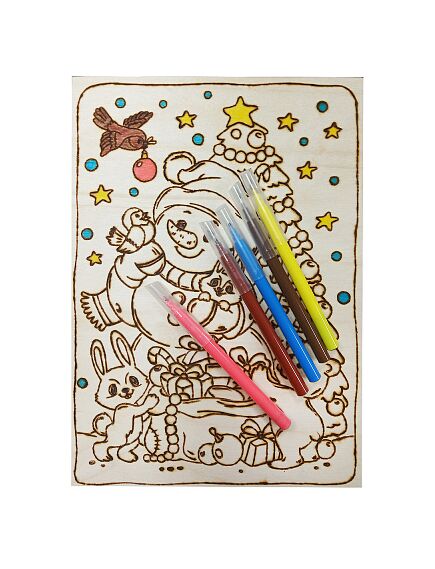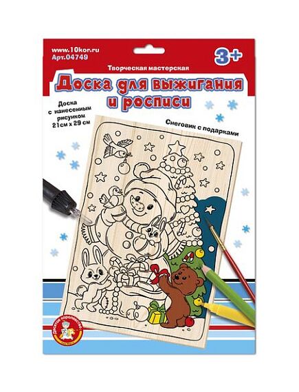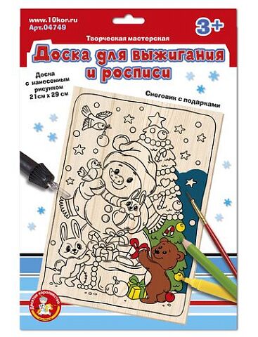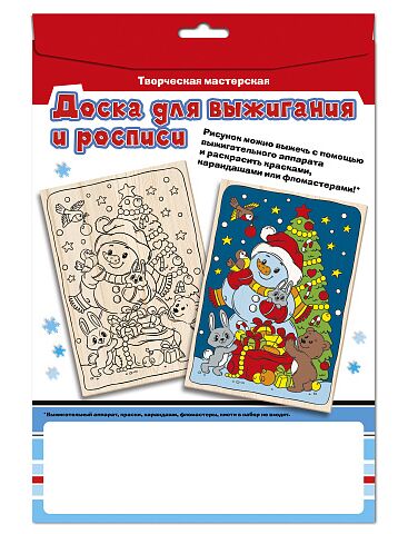 Доска с рисунком для выжигания и росписи «Снеговик с подарком»