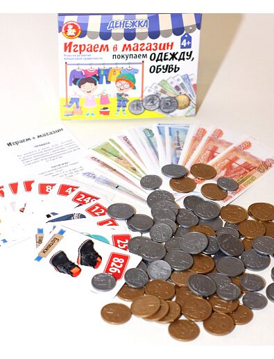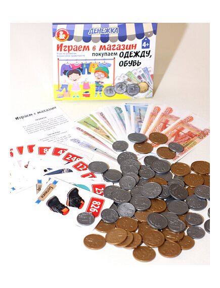 Разложите перед ребёнком карточки с изображением одежды и обуви и попросите его купить все – начиная с самых дешёвых и заканчивая самыми дорогими. Малышу потребуется самостоятельно подобрать нужное количество купюр и монеток и оплатить покупку без сдачи.