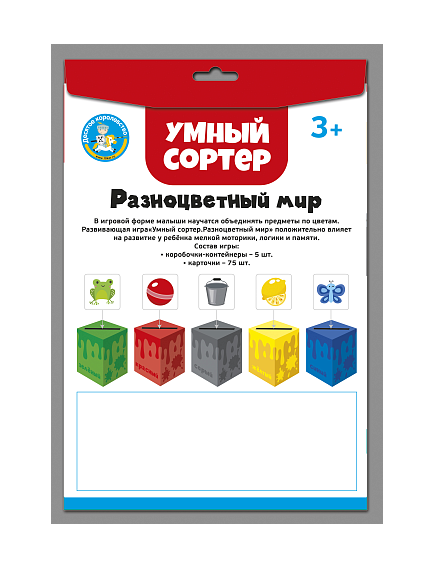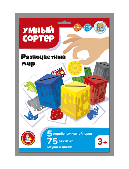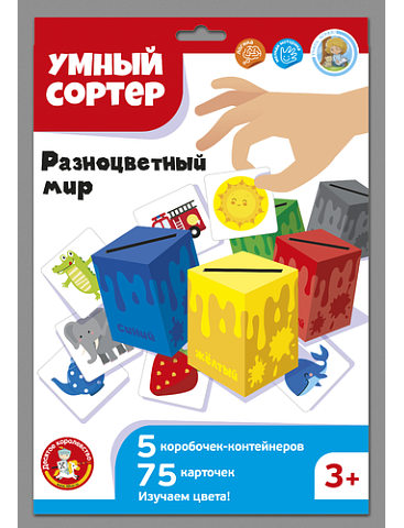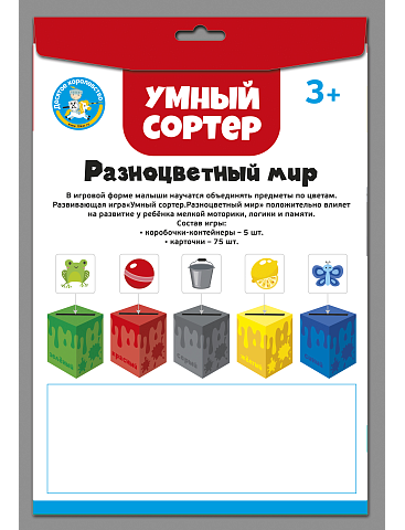 Умный сортер Разноцветный мир – это увлекательная игра для детей от 3 лет, развивающая логику, память и мелкую моторику ребенка.В процессе игры ребенок научится сортировать по цвету. Ему нужно будет разложить по цветным коробочкам карточки с изображениями соответствующего цвета.