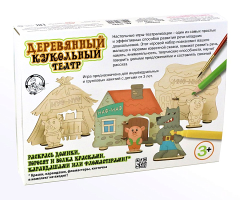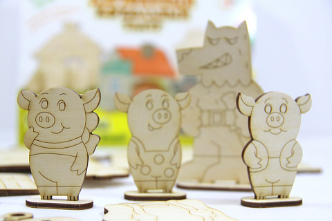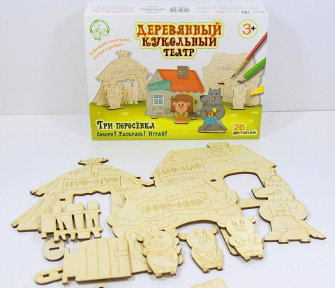 Деревянный кукольный театр «Три поросенка» входит в серию деревянных пазлов для малышей «Собери! Раскрась! Играй!»