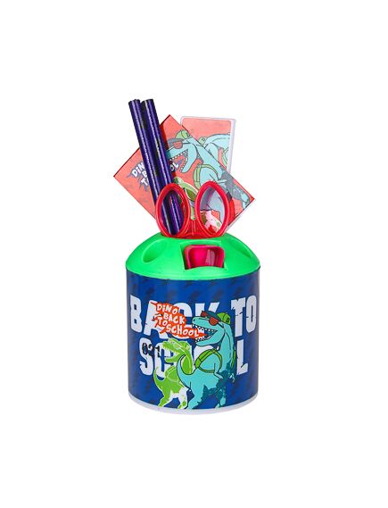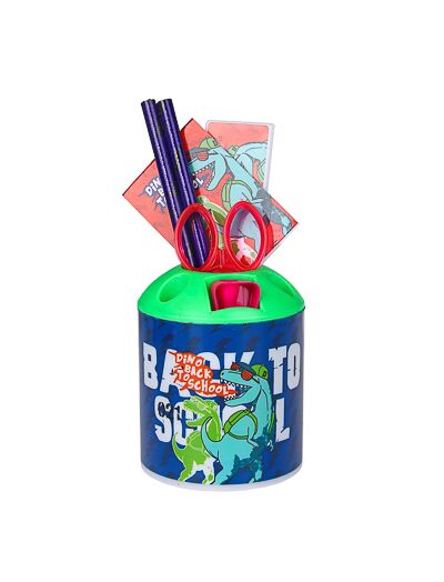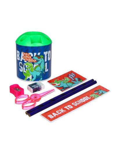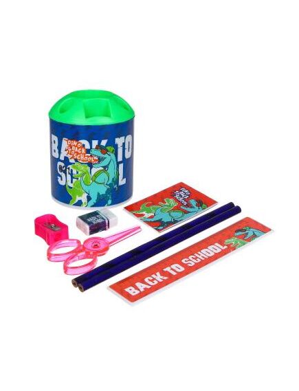ДИНО БЭК ТУ СКУЛ Набор канц. в стакане, 8 предм.: линейка,2каранд.,точилка, ластик, ножницы, блокнот