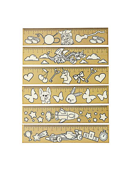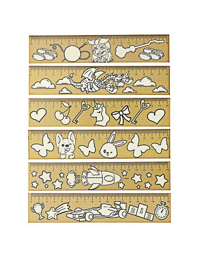Линейка - раскраска 18 см, белая поверхность, контуры рисунков, дерево, инд.маркировка, 6 дизайнов