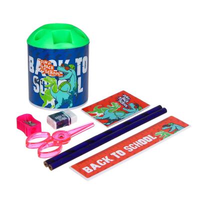 ДИНО БЭК ТУ СКУЛ Набор канц. в стакане, 8 предм.: линейка,2каранд.,точилка, ластик, ножницы, блокнот