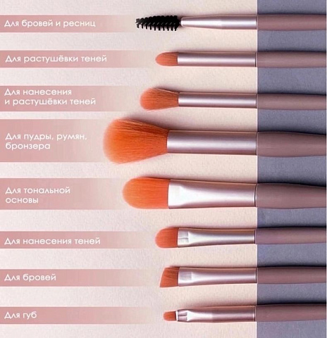 С помощью данного набора вы с легкостью сможете работать как с жидкими, так и с сухими текстурами косметических средств, проработать складочки век, растушевать необходимые оттенки, сделать оформление бровей и аккуратно нанести крем или пудру. Так же дополнительно к набору прилагается удобный чехол-косметичка. Кисточки изготовленьы из высококачественного синтетического ворса, приятные на ощупь, и не вызывают аллергии и раздражения, прекрасно растушевывают косметику, равномерно нанося ее на кожу. Ворс кисточек не лезет и не осыпается. Набор удобно носить с собой даже в самой маленькой сумочке, благодаря его компактности, чтобы всегда в течение дня можно было подправить макияж