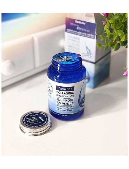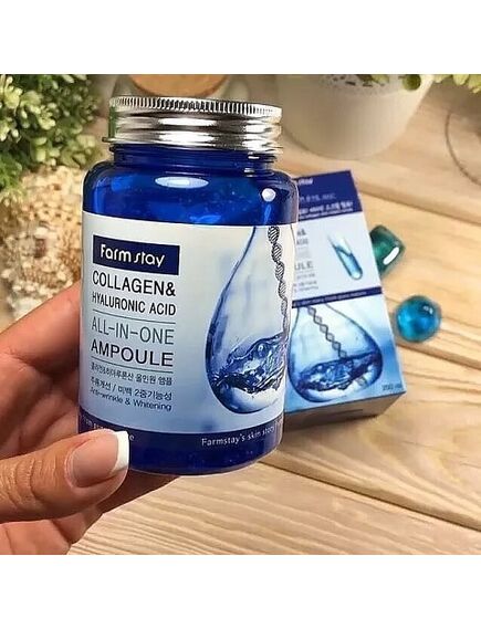 Сыворотка с гиалуроновой кислотой и коллагеном Collagen Hyaluronic Acid All-In-One Ampoule оказывает осветляющий и антивозрастной эффект. Морской коллаген и гиалуроновая кислота поддерживают здоровое сияние и гладкость кожи. Понижение выработки коллагена в коже плохо отражается на ее состоянии.Кожа пересыхает, покрывается морщинками, становится слабее и тоньше. Наша ампула с коллагеном предназначена специально для поддержания свежести и молодости кожи, а также насыщения ее витаминами и минералами.