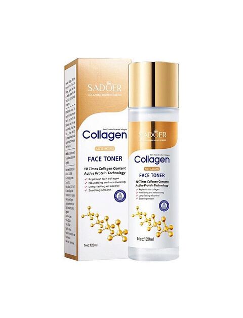 Восстанавливающий тонер для лица с коллагеном Sadoer Collagen Anti-Aging Face Toner предназначен для комплексного ухода за кожей. Формула обогащена гидролизованным коллагеном, увлажняющим и витаминным комплексами. Средство эффективно удаляет излишки кожного себума, ороговевшие клетки и загрязнения, интенсивно увлажняет, способствует синтезу естественного коллагена, а также подготавливает кожу к последующему нанесению эссенции или крема.