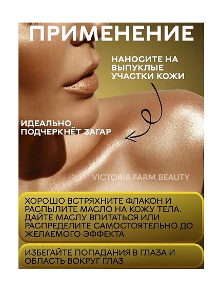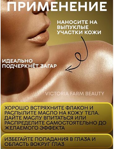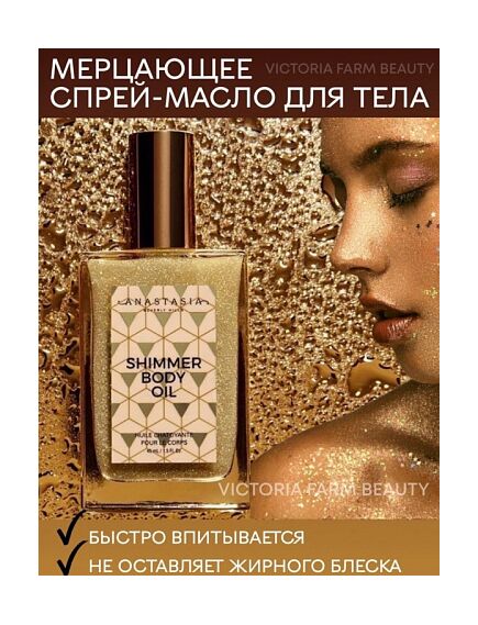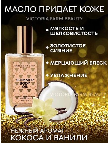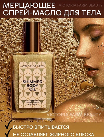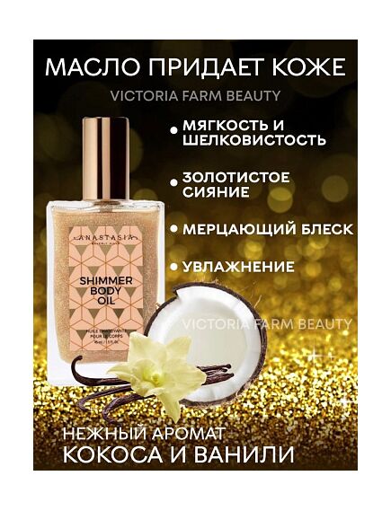 Мерцающее масло для тела Shimmer Body Oil - это роскошное, легкое мерцающее масло, придающее коже солнечное сияние. Шиммер деликатно освещает кожу золотым сиянием и подчеркивает загар. Удовольствие от применения дополнит ванильно-кокосовый аромат. Перед применением: обязательно хорошо встряхните! Крошечные сверкающие частицы в глиттер-спрее ложатся на кожу вуалью и дарят деликатное мерцание. Чем дальше вы держите флакон с распылителем, тем менее насыщено блестки ложатся на кожу. Таким образом вы сможете добиться и едва уловимого сияния (идеально - для визуального выравнивания кожи), и плотного покрытия (используйте как хайлайтер). Мы рекомендуем наносить шиммер на выпуклые участки тела для подчеркивания рельефа. Мерцающее сияние создаст настроение праздника, масло прекрасно подходит в качестве подарка для девушки, женщины.