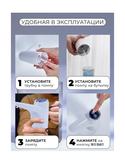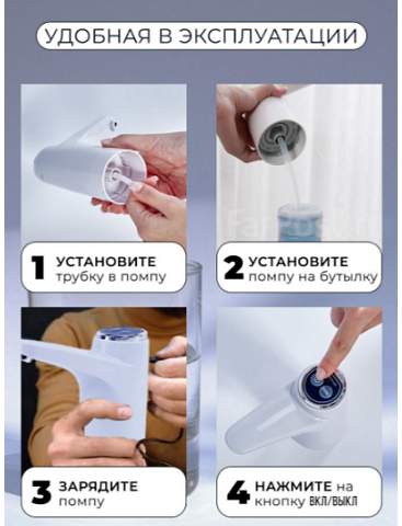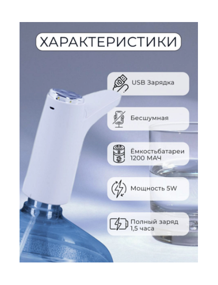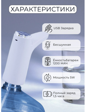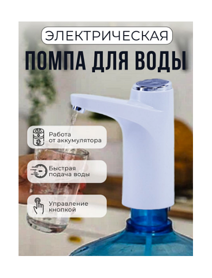 Автоматическая помпа представляет собой удобное приспособление для набора воды из бутылей. При условии использования ручной помпы очищенную бутилированную воду набирать долго и неудобно, особенно пожилым людям и детям. Автоматическая помпа, оснащенная мини-двигателем и емким аккумулятором на 2000 мАч, обеспечивает легкий и комфортный набор необходимого объема воды за короткое время. Использование автоматической помпы исключает необходимость поднимать тяжелый бутыль для того, чтобы установить на столе или специальной конструкции. Достаточно просто подсоединить устройство и можно набирать воду.Простой диспенсер для воды, с одной функцией и 2 кнопками. А еще с аккумулятором и портом зарядки. Без нагрева.