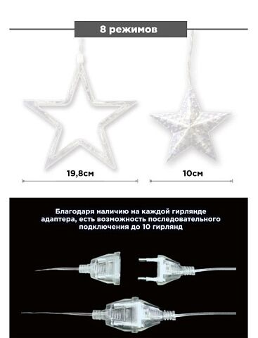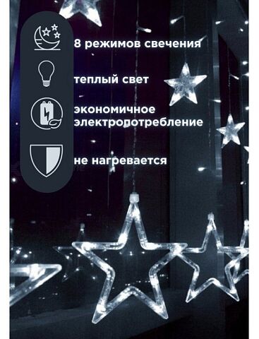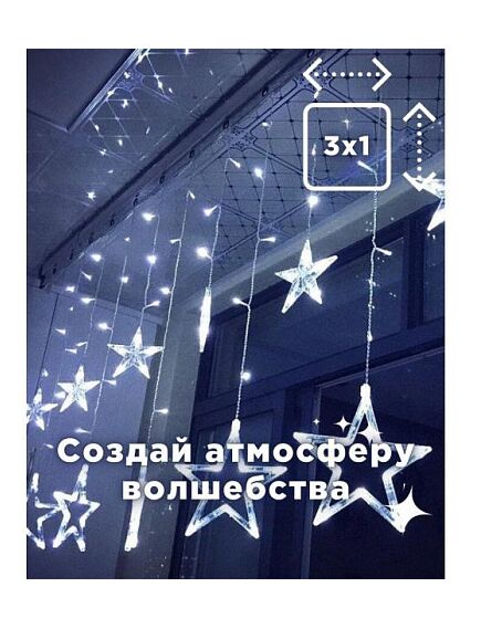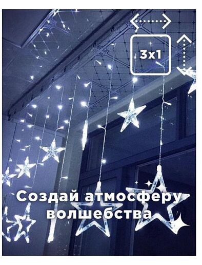 Гирлянда звезды на окно является одним из наиболее красивых и ярких украшений, которое преобразит окошко или стены в вашем доме. Особенно в темное время суток, светодиоды создадут необычную и уютную атмосферу, украшенный объект превратится в небо, усыпанное звездами.- размер 3х1м