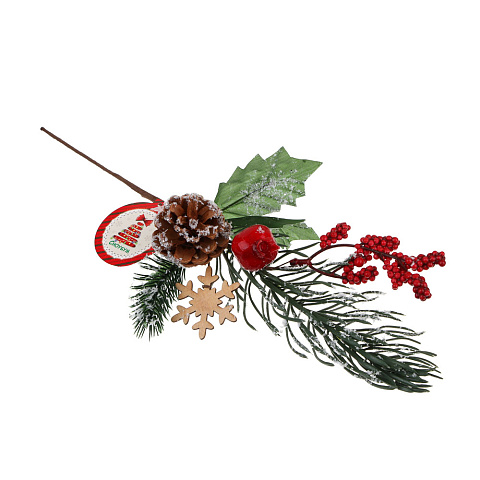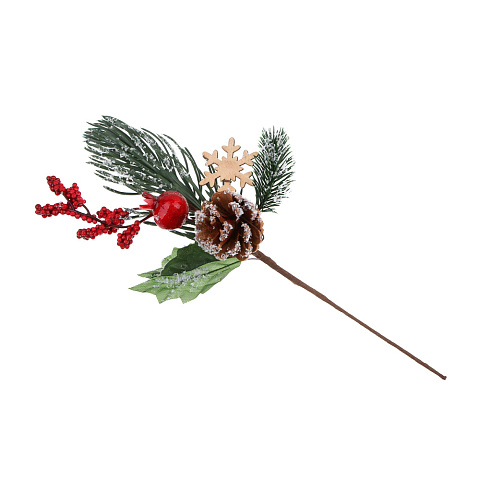 Великолепный элемент новогодних композиций - хвойная ветка с яркими алыми ягодками и снежинками. Особенно здорово смотрится в сочетании с праздничными огоньками новогодних гирлянд. Высота 20 см.