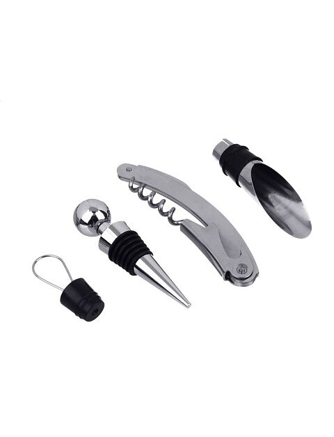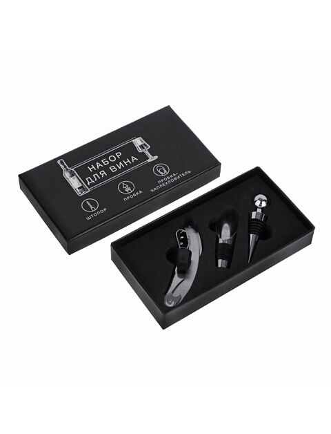 Замечательный набор аксессуаров для вина в футляре оригинального дизайна. Теперь даже обычный пикник можно провести в романтичной, комфортной обстановке. В комплект входит универсальный нож-штопор-открывалка, кольцо для сбора капель, конусная спец-пробка. Оригинальный набор для ценителей вина! День рождения, памятная годовщина, свидание, или же просто встреча с друзьями — с набором для вина не нужно беспокоиться о деталях. Изысканные атрибуты помогут создать правильную атмосферу, в то время как вы будете наслаждаться теплой беседой с гостем или гостями