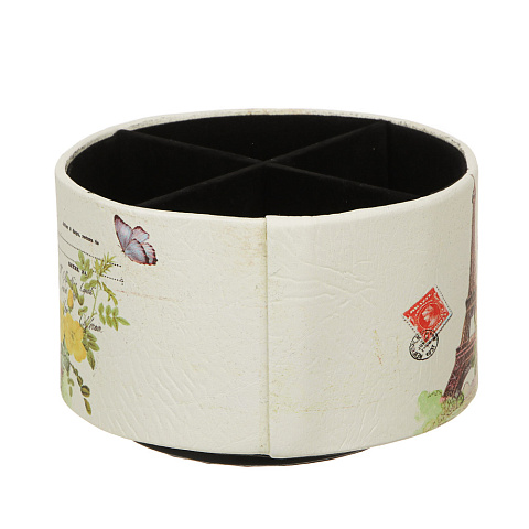 Шкатулка для украшений 14,5х14,5х9,8 см из полиуретана с изображением Эйфелевой башни – это декоративный и практичный аксессуар для хранения ювелирных изделий. Шкатулка с 4-рьмя ячейками в круглом корпусе имеет устойчивое основание, привлекательный эстетичный дизайн, который будет актуален в любом интерьере. Компактная и в то же время вместительная. Изделие можно преподнести в качестве подарка девушке или подруге.