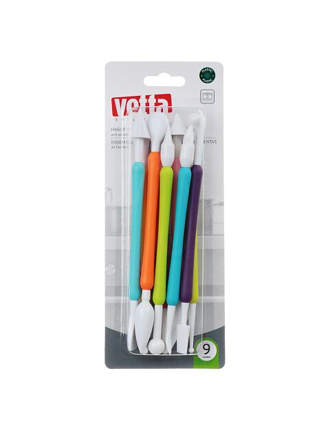 Набор кондитерских инструментов для моделирования VETTA — универсальный помощник для работы с мастикой, сахарной помадкой и марципаном. Каждый предмет выполнен из пластика, удобно ложится в руку и имеет двусторонние наконечники разной конфигурации. Изделия очень удобны и эффективны при лепке фигурок. Применяются для надрезов, подрезки мастики, вырубки отверстий, выдавливания необходимой текстуры и объёма на мастике, создания рюш и оборок, тиснения и множества других необходимых операций. В наборе 9 инструментов.