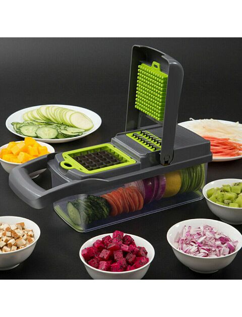 Овощерезка заменит массу кухонных приспособлений и существенно облегчает Ваш труд на кухне. Нарезать лук мелкими кубиками, нашинковать морковь и свёклу соломкой, идеально нарезать тонкими слайсами кабачки, баклажаны или огурцы и многое другое!Терка - овощерезка быстро и качественно нашинкует овощи и фрукты разнообразными способами! Она разработана совместно с профессиональными шеф-поварами, а это значит, что в ее конструкции учтены все необходимые качества для быстрой и легкой нарезки. В комплекте с теркой вы найдете 8 насадок для шинковки и 1 насадку для отделения яичного белка. Нарезанные продукты будут попадать в специальный контейнер, который оснащен резиновыми накладками, что не позволит ему скользить по рабочей поверхности. Для протекции Ваших рук разработан универсальный держатель, который сохранит ваши пальцы в безопасности. Измельчитель выполнен из высококачественного ABS пластика, а острые лезвия с лазерной заточкой - из нержавеющей стали. Так же в комплекте есть овощечистка. Терка сделает за Вас самую сложную работу на кухне, сэкономит время и превратит каждое блюдо в настоящее произведение искусства.