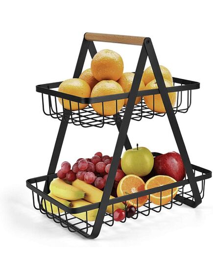 Корзина для фруктов сделанная из металла м деревянной ручкой, подойдет для хранения фруктов, хлеба, печенья, конфет и других продуктов. Стильная металлическая фруктовница в стиле лофт имеет 2 яруса и вмещает более 4кг фруктов, но при этом имеет достаточно компактные размеры. Поставляется в разобранном виде.Высота 32см, размер нижней корзинки 30*18см, размер верхней корзинки 24*18см