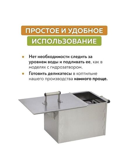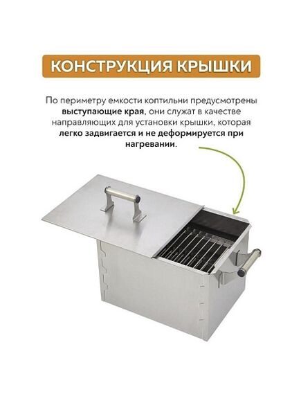 Оборудование представляет собой металлический ящик с крышкой. Внутри него устанавливается решетка для выкладки продуктов и поддон для жира. Для приготовления продуктов коптильню устанавливают на мангал или костер (коптильня используется только на открытом воздухе). Достаточно одной горсти опилок лиственных деревьев, чтобы приготовить вкусные копченые продукты.
