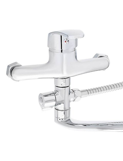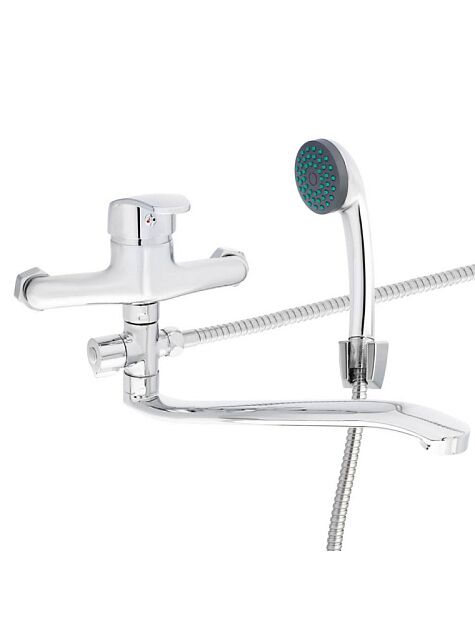 Смеситель для ванны (566-169) оснащен длинным изливом и комплектом для душа, обеспечивающим комфортные водные процедуры.