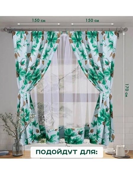Шторы изготовлены из 2-х полотен, каждое по 150см на шторной ленте. Шторная лента 4см., на ленте петли для крючков, также можно повесить штору на трубу диаметром не более 20 мм.