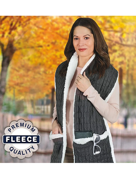 Шарф жилетка на пуговицах теплая, сделана из флиса, с карманами для размещения различных мелочей. Имеет универсальный цвет, размер - подходит мужчинам, женщинам. Отличное решение, способное согреть в зимние вечера и создать комфортные условия.