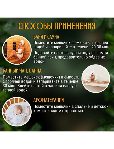 Использование хвойных запарок - это древний способ сделать пар в бане приятным и одновременно полезным. Целебные вещества пихты вместе с паром попадают в организм и оздоравливают его. Измельченные веточки пихты, собранные в экологически чистых местах, расфасованы в мешочки, благодаря чему хвоинки не попадут в отвар и не повредят Ваши руки.Способы применения: