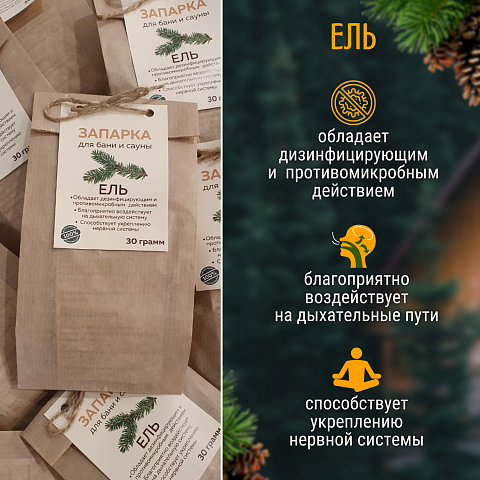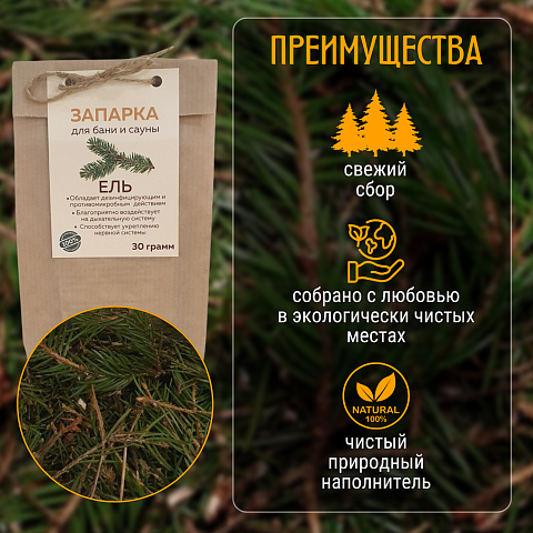 Использование хвойных запарок - это древний способ сделать пар в бане приятным и одновременно полезным. Целебные вещества ели вместе с паром попадают в организм и оздоравливают его. Измельченные веточки ели, собранные в экологически чистых местах, расфасованы в мешочки, благодаря чему хвоинки не попадут в отвар и не повредят Ваши руки.