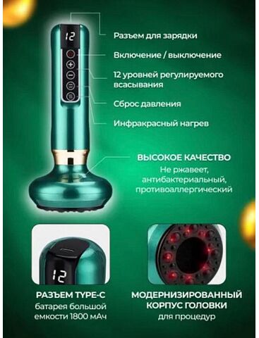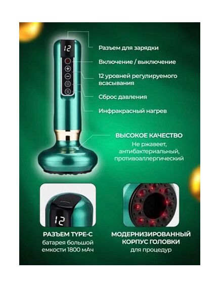 Вакуумный массажер для тела - это косметический аппарат, который необходим для женщин и мужчин. Антицеллюлитный массажер это комплекс для оздоровления организма, коррекции фигуры и ухода за кожей. Также убирает растяжки и целлюлит. Подходит для коррекции фигуры и для уменьшения объемов. Вакуумный аппарат ускоряет процесс борьбы с подкожным жиром, помогает выводить токсины, шлаки и излишки жидкости. Избавляет от отечности, усиливает обмен веществ в клетках кожи и стимулирует похудение. Действие массажа основано на таких массажных техниках, как: баночный вакуум, лимфодренажный и массаж Гуаша, LPG массаж, горячий компресс. Наш электрический прибор для тела расслабляет мышцы, улучшает ток крови и лимфы, снимает мышечное напряжение, спазмы и зажимы, за счет чего кожа становится упругой. Массажер для ног и рук заменит сеанс расслабляющего массажа, способствует омоложению. Баночный массаж и прогрев тканей улучшает периферийную циркуляцию крови, межтканевой жидкости, а также используют при респираторных заболеваниях и простудах. Самомассаж для шеи окажет комплексное расслабление, чувство релакса, антистресс, уменьшатся отеки. Устройство для похудения живота помогает убрать жир, живот станет упругим. LPG массажер поможет разгладить апельсиновую корку на бедрах и ягодицах и поможет уменьшить объемы. Ручной аппарат имеет инфракрасный нагрев и 12 режимов интенсивности всасыванияю. Каждый сможет себе подобрать свой уровень массажа. Возьмите с собой в путешествие, командировку, отпуск или баню. Lpg массажер – отличная идея для мужского и женского подарка к празднику. Преподнесите подарок любимой жене, мужу, подруге или другу, брату или сестре. Уместный презент для родителей маме, папе, дедушке или бабушке на день Матери, новый год или день рождение. Рекомендуем использовать массажное масло для большего эффекта от применения ручного стимулятора. В результате использования нашего LPG массажера улучшите состояние здоровья и самочувствия.