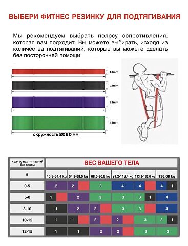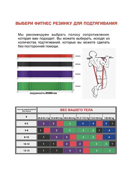 Ширина красной резинки 13 мм, черной резинки - 22 мм, фиолетовой резинки - 32 мм, зеленой резинки - 44 мм. Длина всех резинок одинакова – 2,1 м.