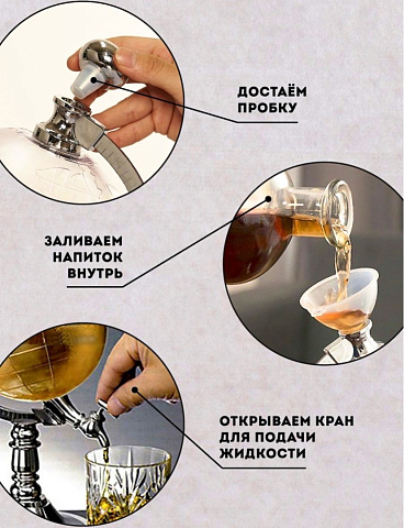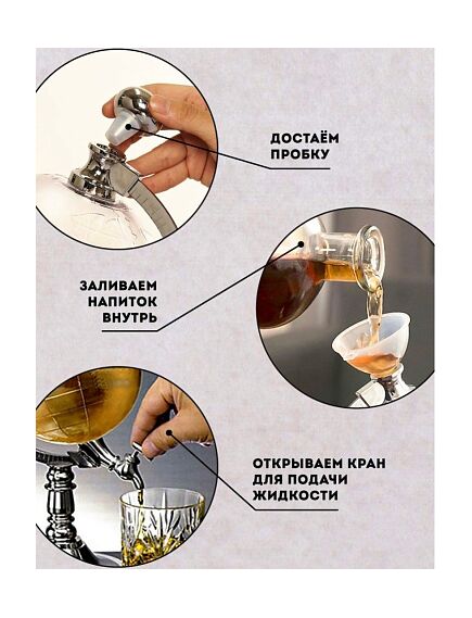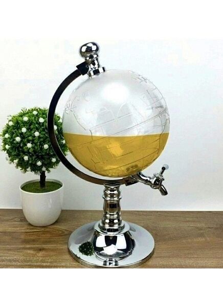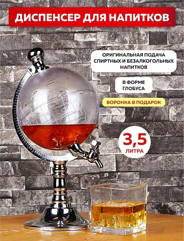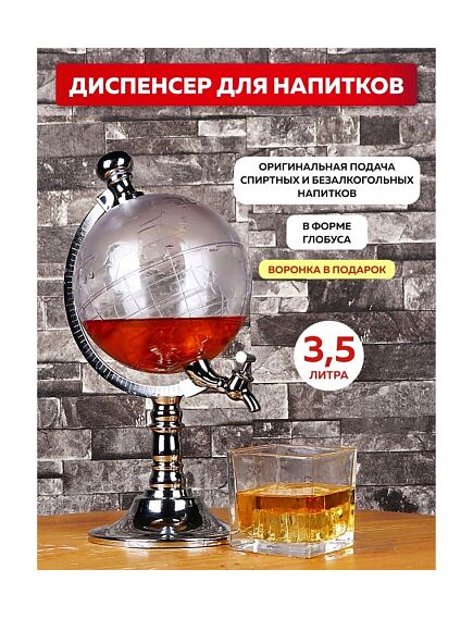 Очень элегантная и необычная вещь для людей, для которых важен не только вкус, но и презентация.Как пользоваться Верхняя часть глобуса – крышка. Она открывается, в глобус наливается напиток, крышка закрывается – все готово. Теперь нужно открыть краник и разлить напиток по стаканам. Чтобы аккуратно налить в диспенсер напиток, нужно воспользоваться воронкой – она есть в комплекте.