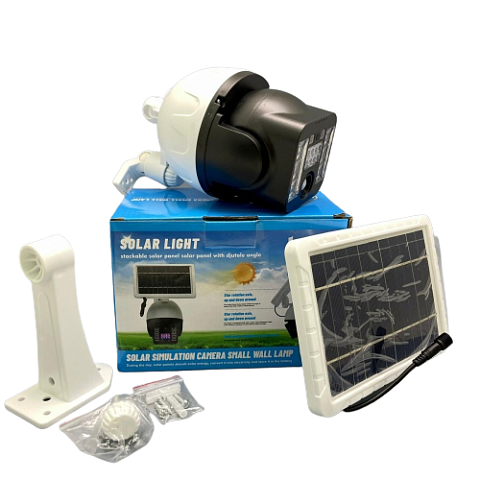 Это устройство введет в заблуждение любого злоумышленника. Он решит, что на территории, где установлена камера муляж ведетcz видеонаблюдение. Но это уличный светильник, который работает от заряда солнечной панели. Оснащен датчиком движения.
