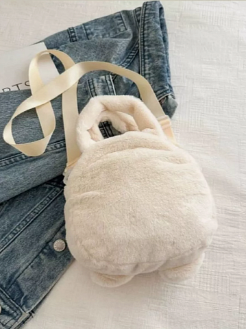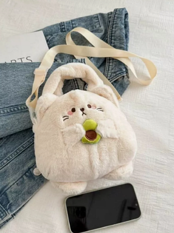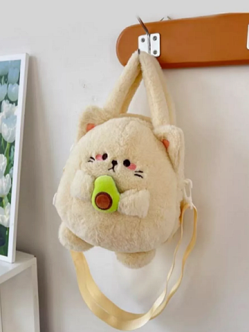 Сумочка плюшевая Котик бежевый с авокадо 20 см, ремешок в комплекте.