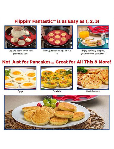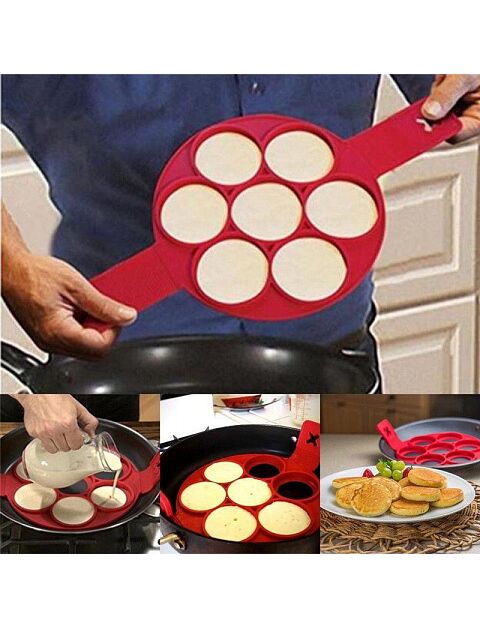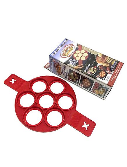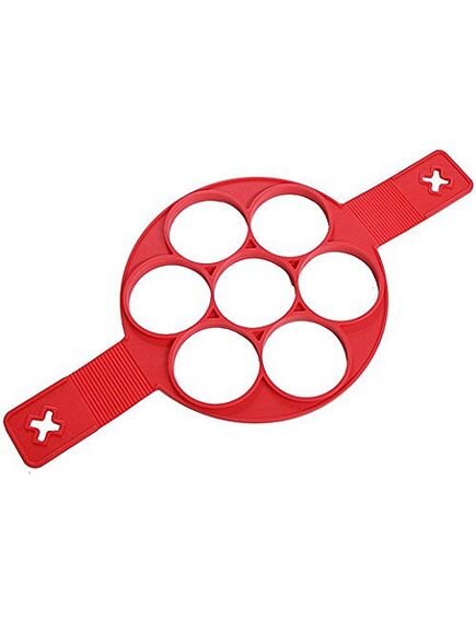 Секрет приспособления заключается в том, что для его изготовления был использован пищевой силикон, к которому не пристает тесто. Силиконовая форма для оладий имеет 7 углублений. Плоское силиконовое кольцо в каждом углублении удерживает оладьи во время переворачивания. Поэтому приготовление оладий теперь станет быстрым и не хлопотным. Достаточно купить силиконовую форму и Вы каждое утро сможете баловать свою семью аппетитными оладушками, блинчиками, сырниками или другими вкусными блюдами.
